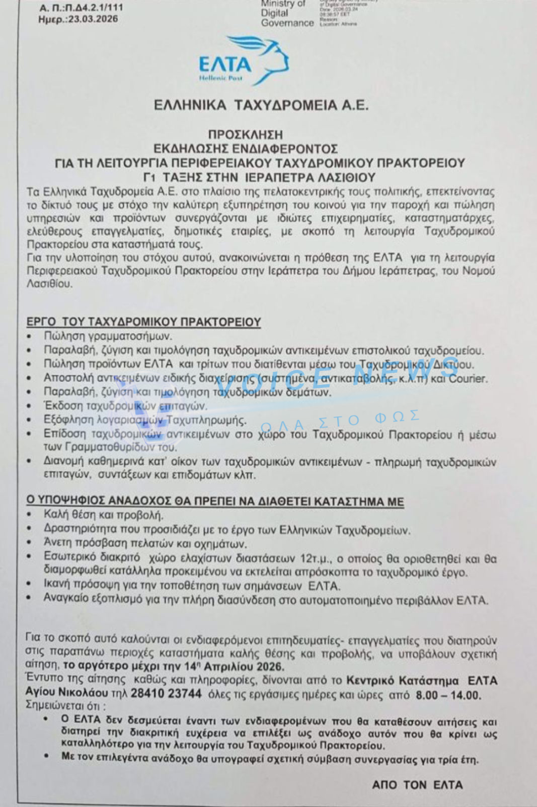 ανατέθηκε σε τοπική ιδιωτική επιχείρηση της ELTA Courier, η οποία
