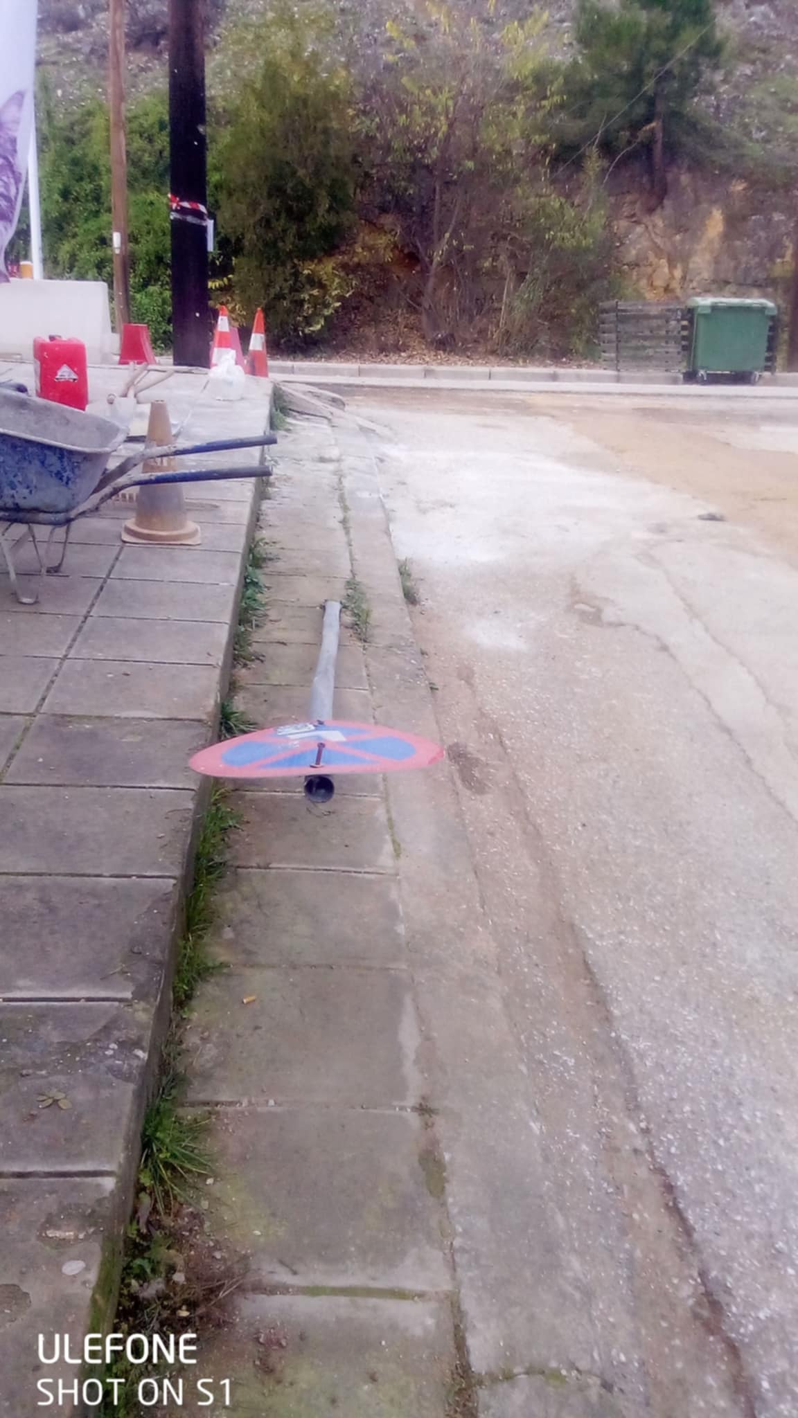 Ανανέωση 2- 12-2025 -  Μια πινακίδα σήμανσης,  πεσμένη μεταξύ πεζοδρομίου και δρόμου στο κέντρο της πόλεως της Καστοριάς. Κανείς αρμόδιος δεν έδειξε το έδειξε το ενδιαφέρον του όπως έχει νομική υποχρέωση.